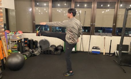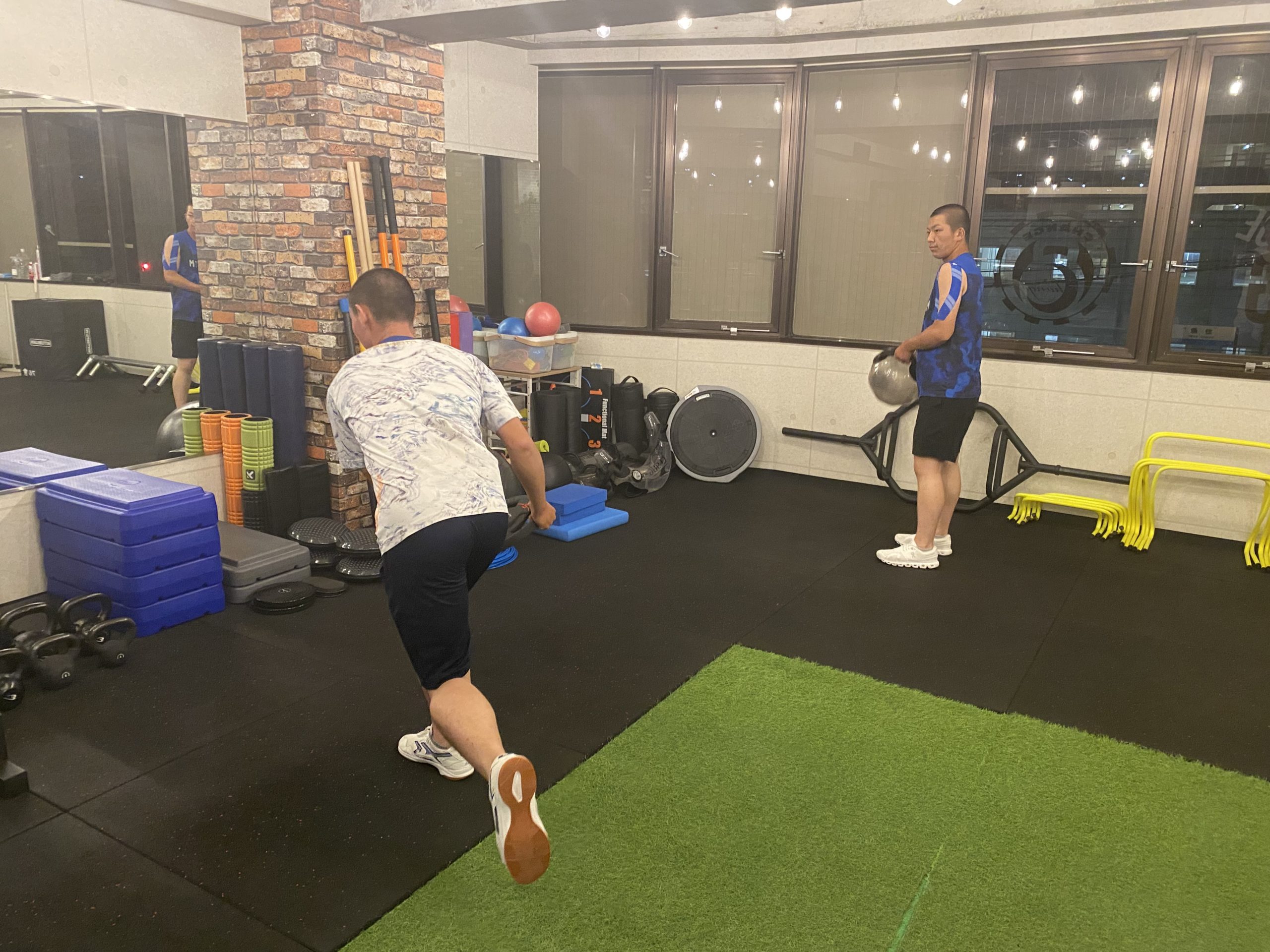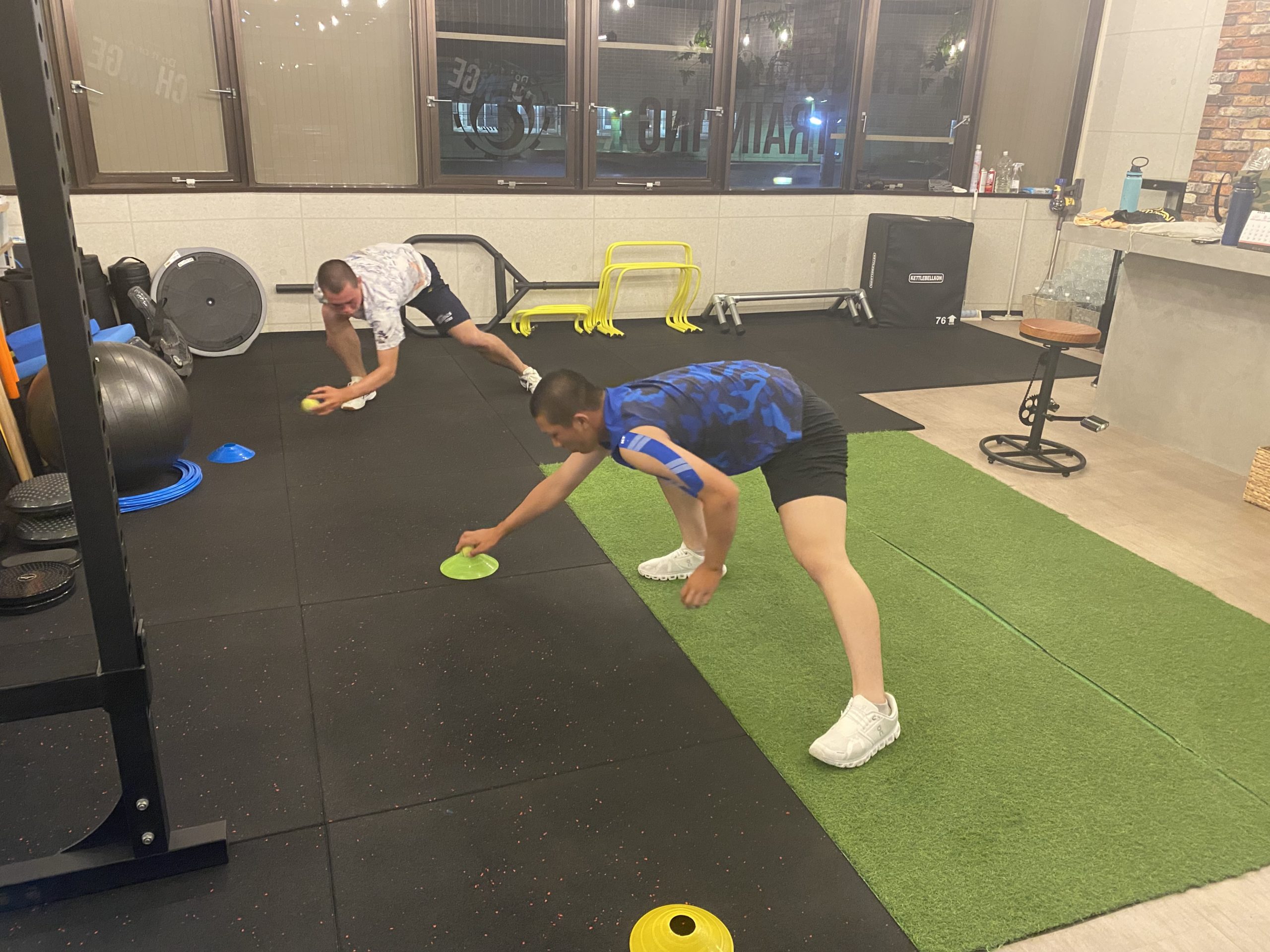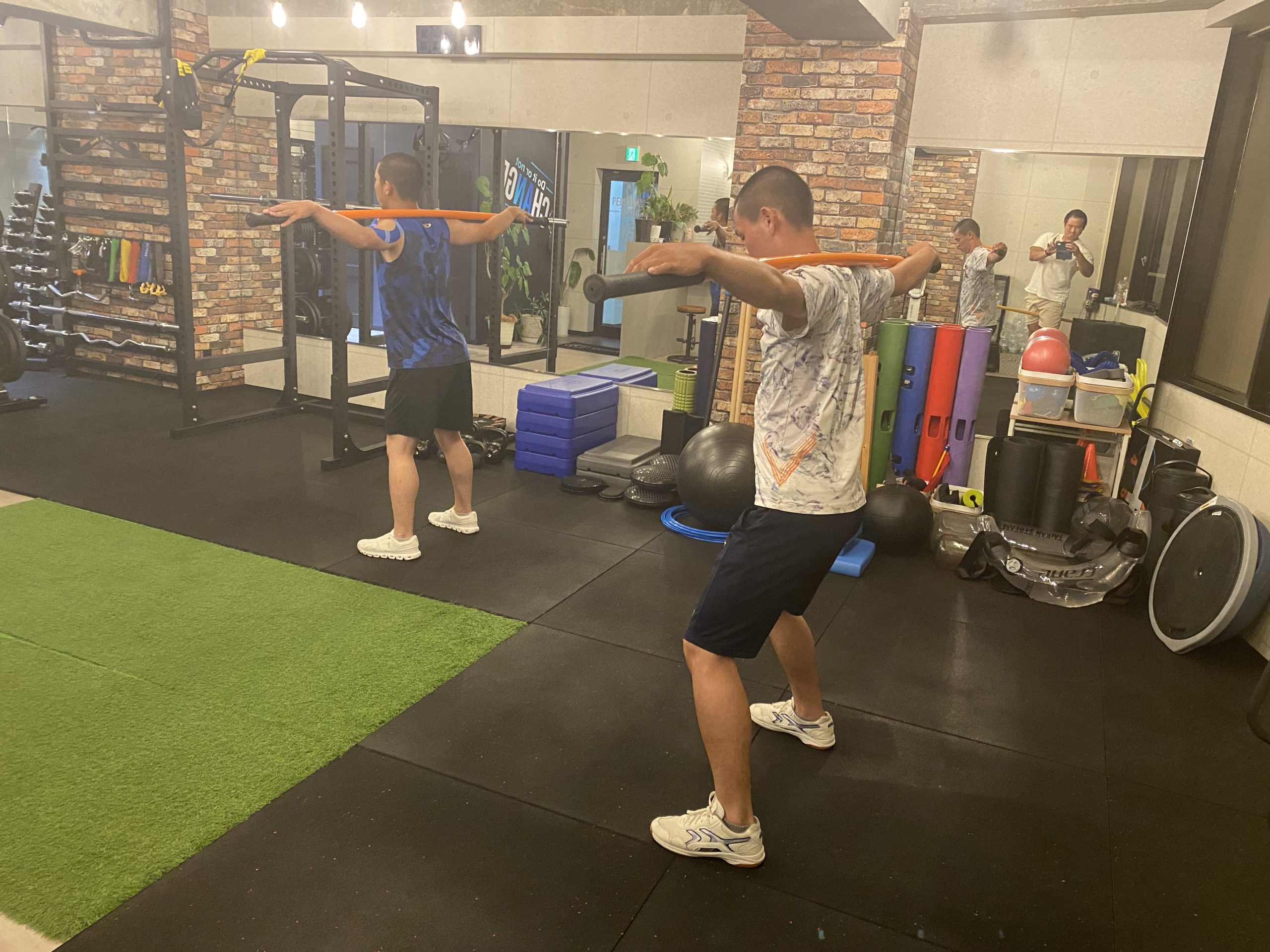 投球動作に必要な動き作り、軸足、踏み込み足の安定性を作るドリルを中心に90分間パーソナルトレーニングを行いました。