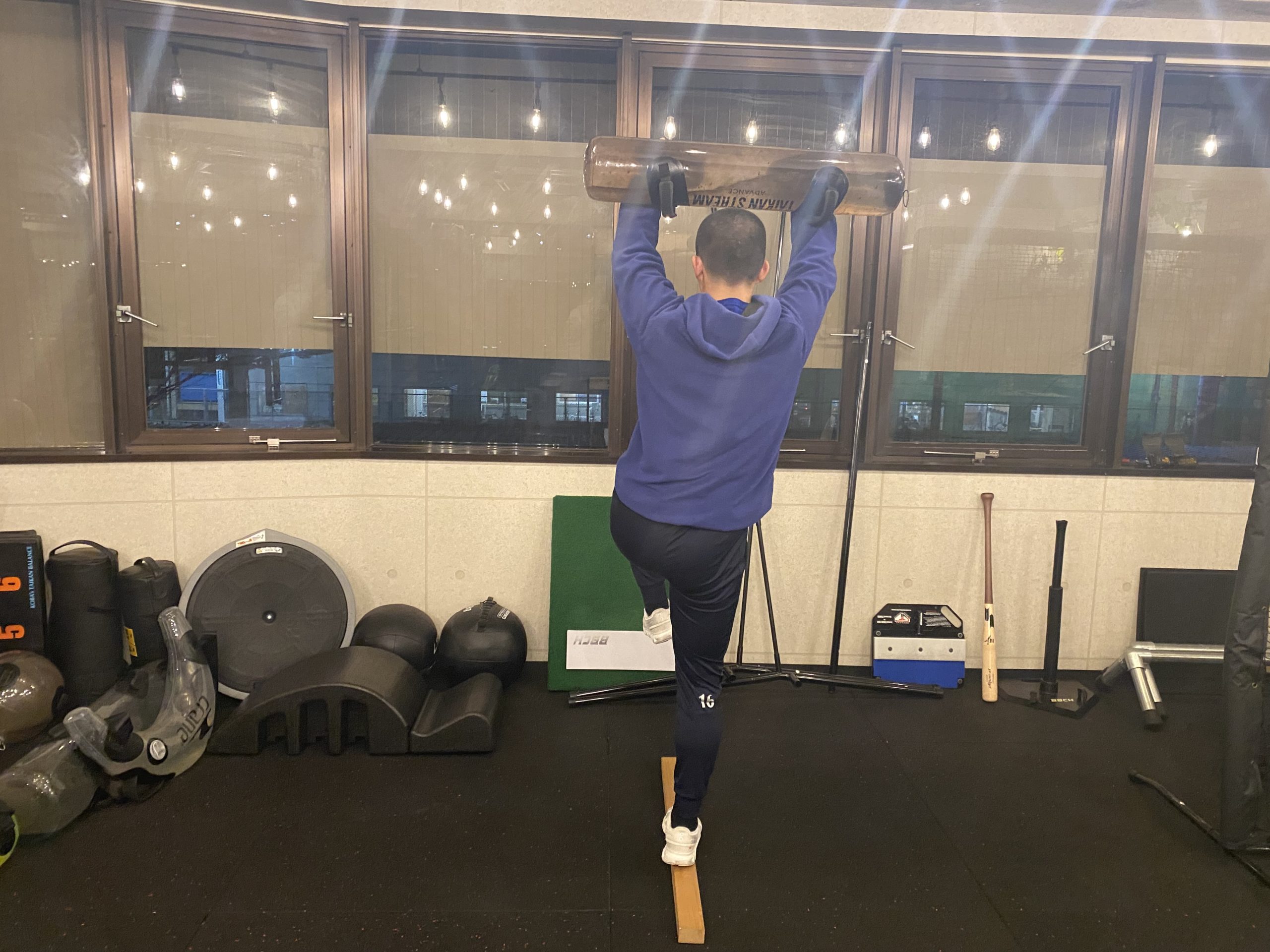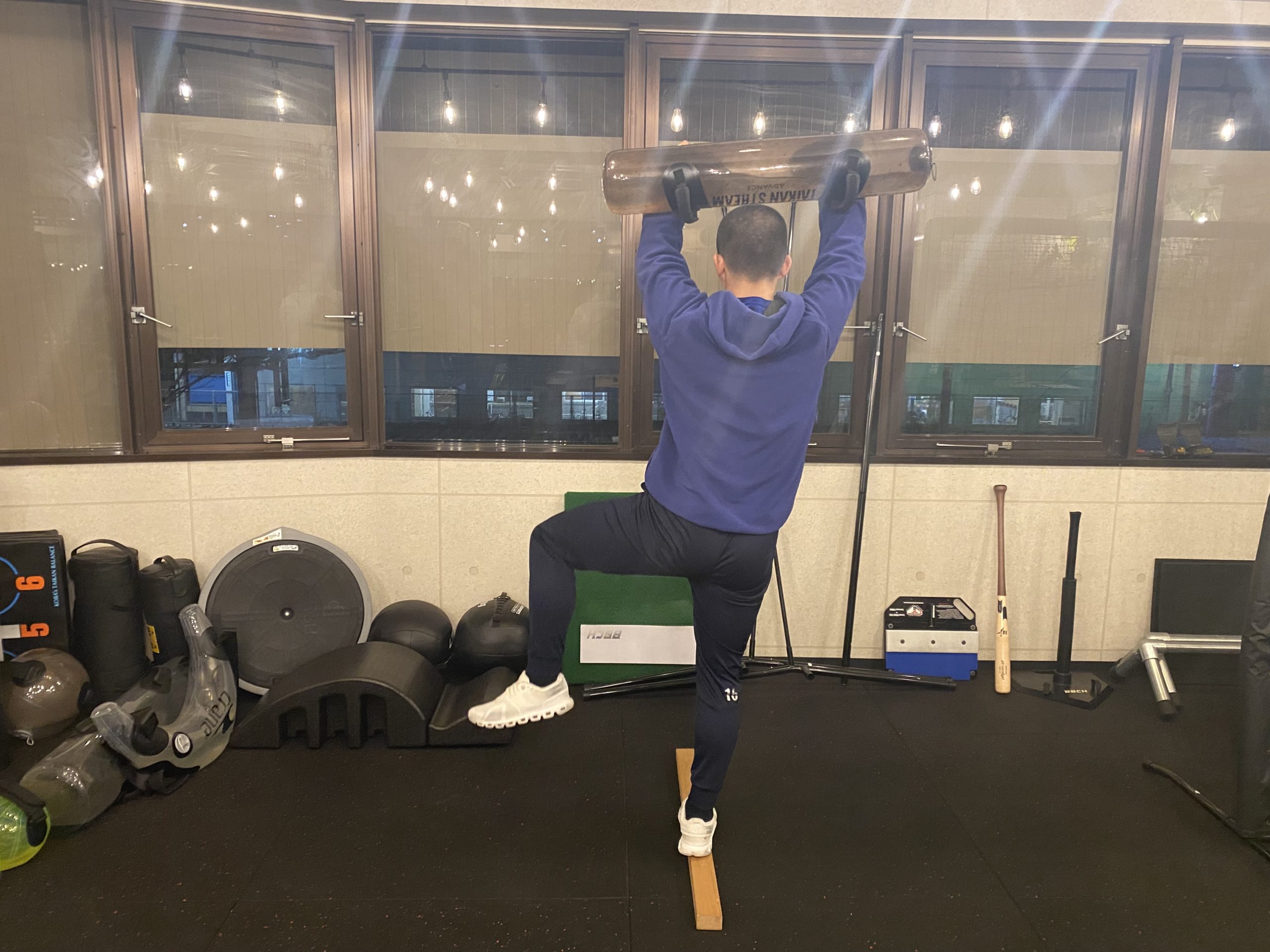 画像にもある通り、まずは板の上にまっすぐ立つことが基本です。軸足の足裏に重心を乗せ、その状態でウォーターバッグ(水が不規則に動く負荷)を扱います。