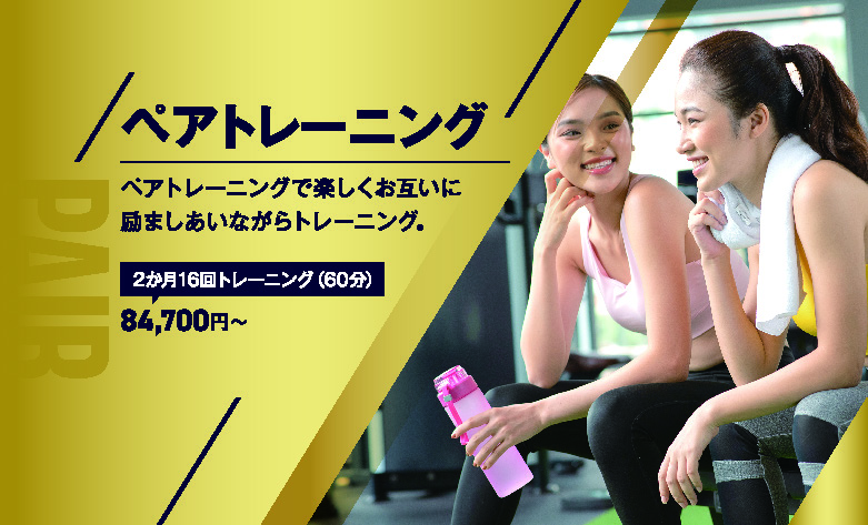 2人1組で同じメニューに取り組むペアトレーニング。ハードな筋トレではなく、会話と笑顔がある運動習慣を目指します。ペースは常に体力の低い方に合わせ、無理なく進めていきます。